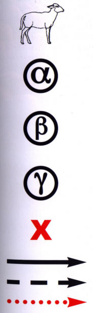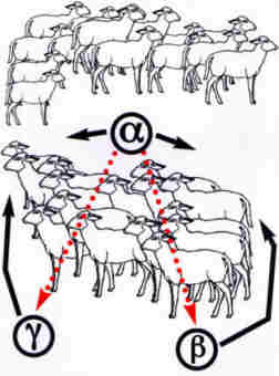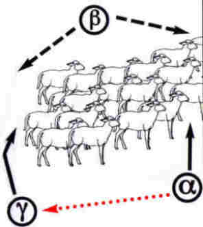 "Handzeichen 0" des Alpha- WolfsIn dieser Angriffsformation treiben a und y Wolf die Schafherde auf den bereitgestellten ß Wolf zu, der der Herde den Weg versperrt und ein Ausbrechen zur Seite durch stetiges Pendeln nach rechts und links verhindert. Die Beutetiere werden so direkt in die Fänge des lauernden ß Wolfes getrieben. Es entsteht eine Art Kessel, aus dem ein gewähltes Opfer, bei guter Rudelarbeit, nicht mehr entfliehen kann. |