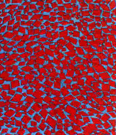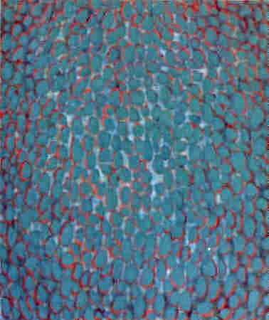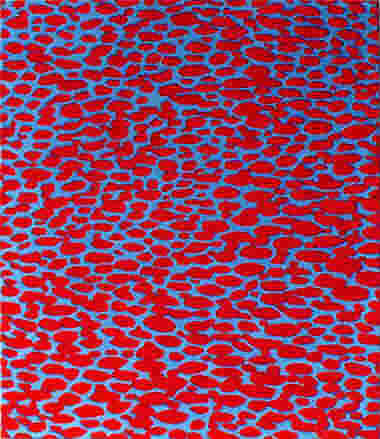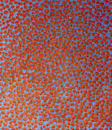 Frankfurter Allgemeine Zeitung vom 9.August 2001 Kieselsteine im Bachbett Malerei von Lionel Röhrscheid Eine seltsame Wirkung geht von diesen Bildern aus. Dabei zeigen die zum Teil großformatigen Werke Lionel Röhrscheids, die derzeit in der Frankfurter "Ausstellungs-Halle Schulstraße lA" zu sehen sind, auf den ersten Blick motivisch nur wenige Variationen. Rosa Flecken auf hellblauem Grund, blaue Flecken auf schwarzem Grund, leuchtend rote Flecken auf hellblauem Grund. Dabei geht der 35 Jahre alte Städelabsolvent und Meisterschüler bei Hermann Nitsch intuitiv vor, wählt zunächst einen Grundton, dann eine häufig den Kontrast hervorhebende Farbe für die 'Tupfen, die mal rund, mal eckig oder geschliffen wirken, kaum oder stark konturiert den Arbeiten Tiefe verleihen. "Transfigurative Malerei" nennt Röhrscheid diese Bilder, die das Verhältnis von Vorder- und Hintergrund zum zentralen Thema haben.
