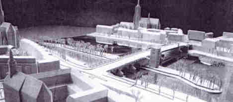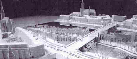 Der Wettbewerbsentwurf von Albert Speer belässt es bei der jetzigen flachen Silhouette der Alten Brücke, dessen leicht geschwungene Stahlträger in der Brückenmitte an den ebenfalls aus seinem Büro stammenden Holbeinsteg erinnert. Auf der Maininsel erweitert Speer die Brücke zu zwei Bastionen, was die Jury zu dem Lob von "zu hoher Aufenthaltsqualität veranlaßte. In eine der Bastionen soll die Statue Karls des Großen einziehen, die zurzeit noch vor dem Historischen Museum steht. Die Bauarbeiten für die neue Alte Brücke sollen im Jahr 2004 beginnen und eineinhalb Jahre dauern. Die Baukosten werden ersten Schätzungen zufolge 30 Millionen Mark betragen. |