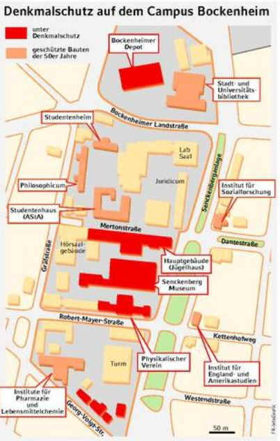Seit geraumer Zeit stehen Bauten der Nachkriegszeit in Frankfurt am Main zur Disposition. Mit dem umstrittenen Abriss des Zürich-Hauses im Februar 2002 wurde an der einst als Hochhausachse konzipierten Bockenheimer Landstrasse ein unerfreulicher Umbau eingeleitet, der bald die Bauten des Universitätscampus erreichen dürfte.